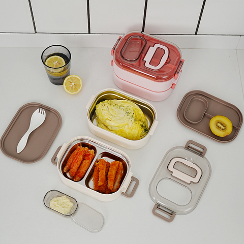กล่องข้าวกลางวันวางซ้อนกันได้หลายช่องทำจากสแตนเลส PP + 304ใหม่มีให้เลือกใช้วัสดุปลอดภัยสำหรับอาหารหลายสี